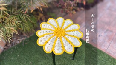 かぎ針編みで作るガーベラ風の円座布団をご紹介。立体的な花びらが可愛く、椅子や床、インテリアとしても楽しめる手編み作品です。
