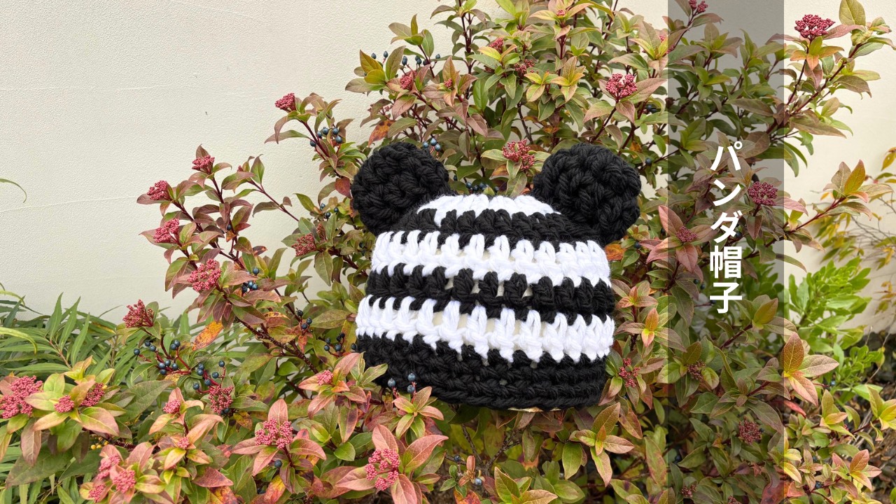 手編みのパンダ帽子は、ジャンボかぎ針でザクザクとお編みいただけます。